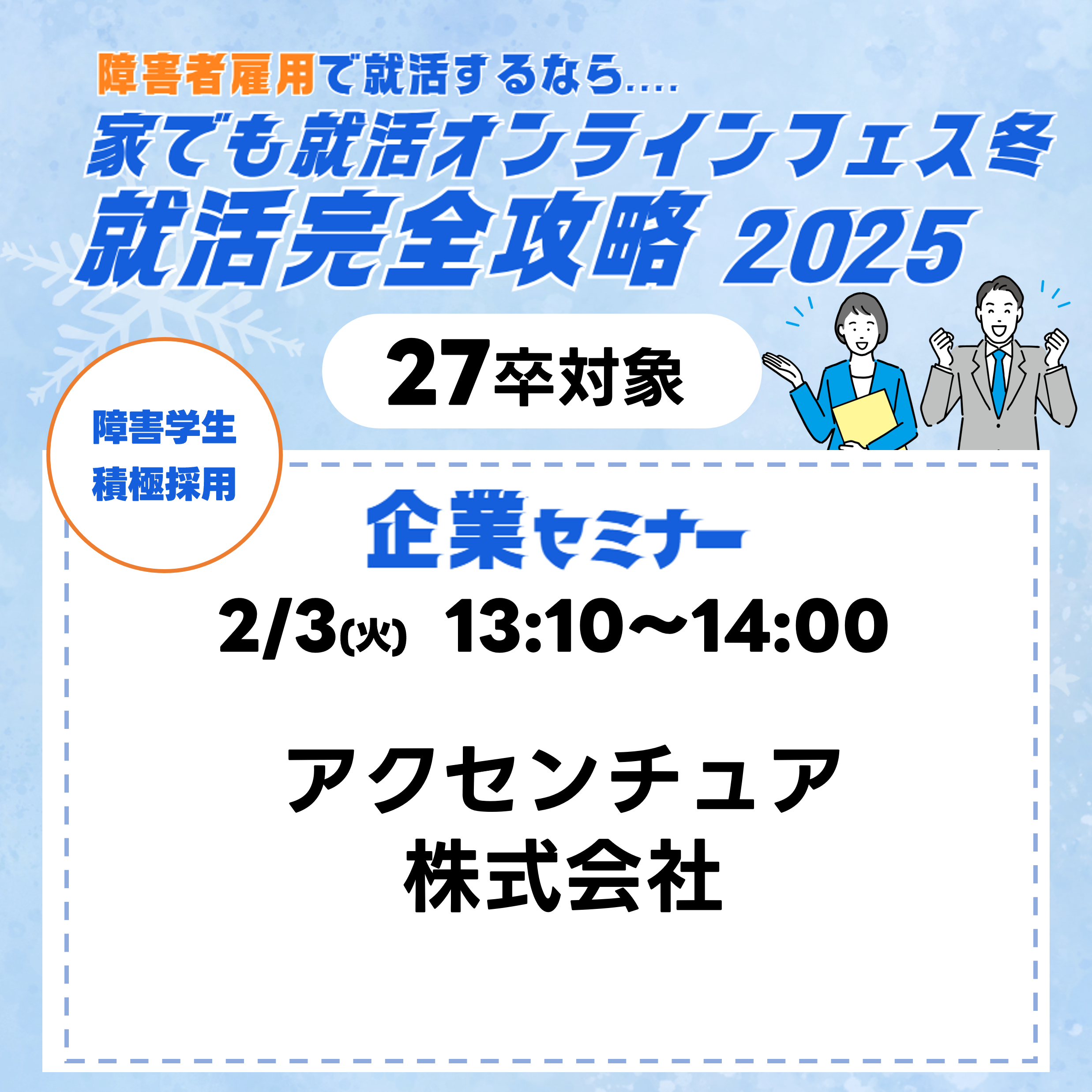 家でも就活オンライン事務局【27卒】就活完全攻略2025ーアクセンチュア株式会社ー実施日2026/02/03(火) 13:10~14:00対象者新卒2027年既卒・その他―