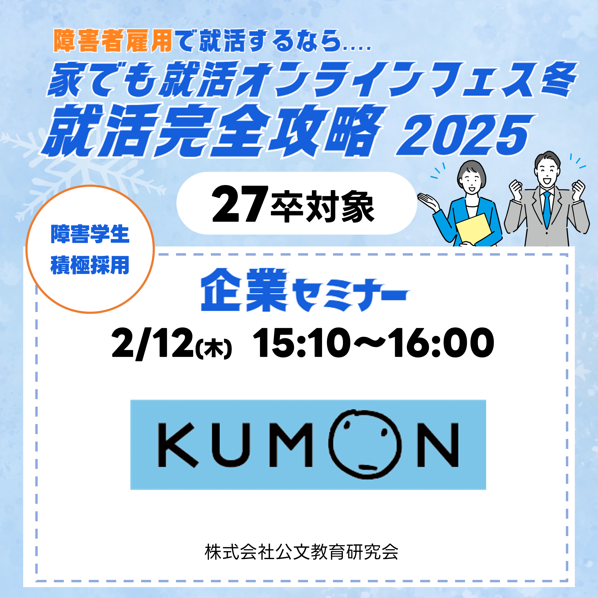 家でも就活オンライン事務局【27卒】就活完全攻略2025ー株式会社公文教育研究会ー実施日2026/02/12(木) 15:10~16:00対象者新卒2027年既卒・その他―