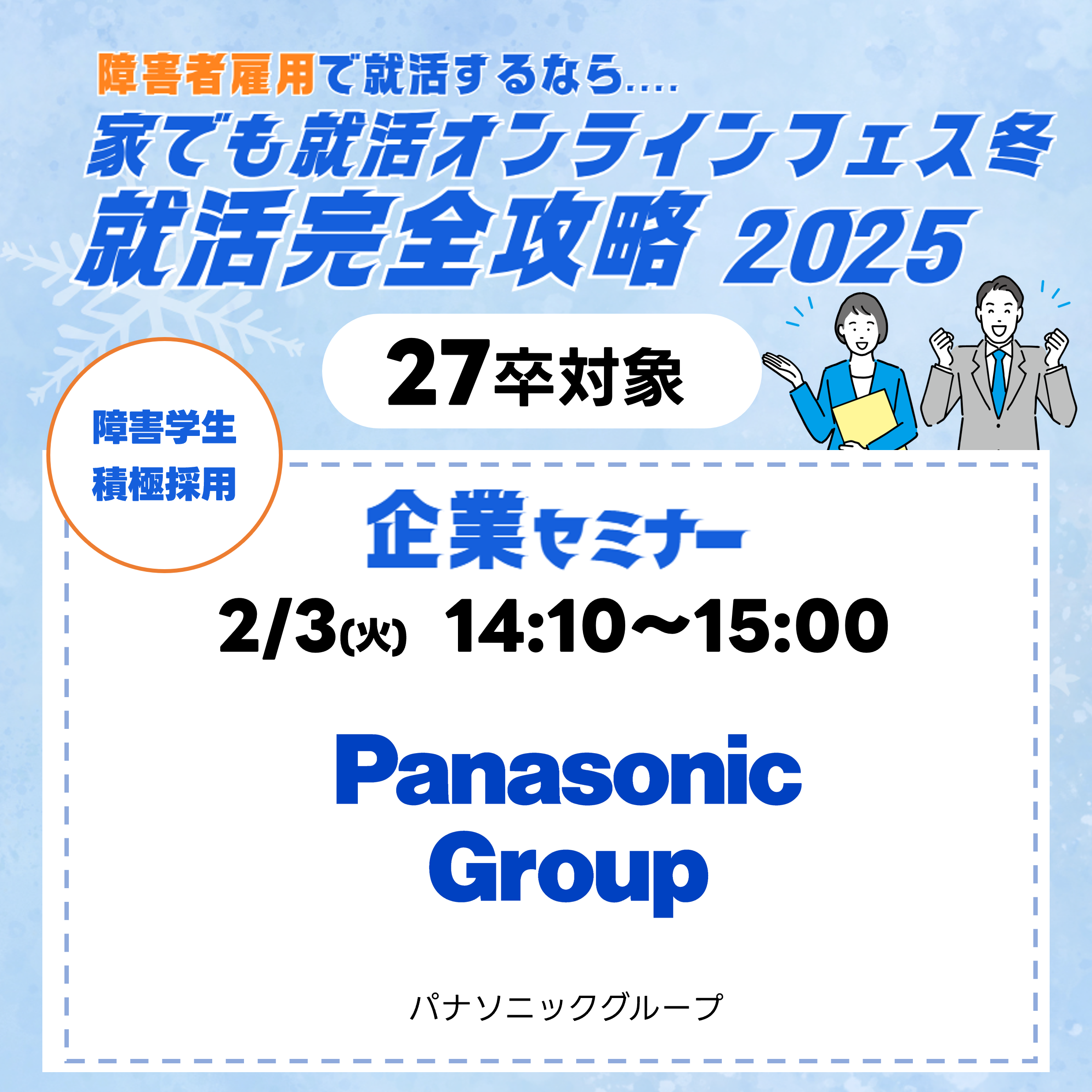 家でも就活オンライン事務局【27卒】就活完全攻略2025ーパナソニックグループー実施日2026/02/03(火) 14:10~15:00対象者新卒2027年既卒・その他―
