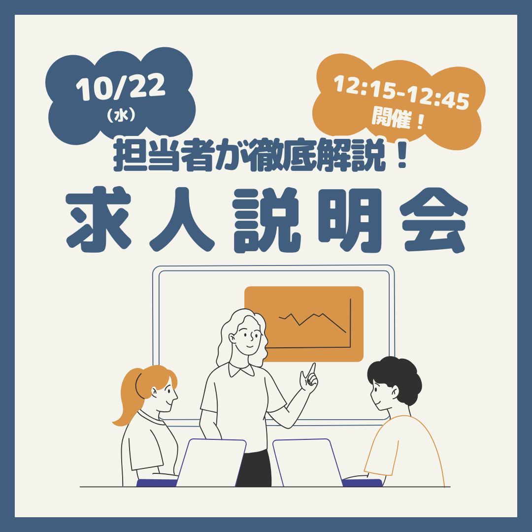 - 家でも就活オンライン事務局【26卒】担当者が解説!求人説明会(諦めないで!現在募集中の企業特集)実施日2025/10/22(水) 12:15~12:45対象者新卒2026年既卒・その他2024年2025年