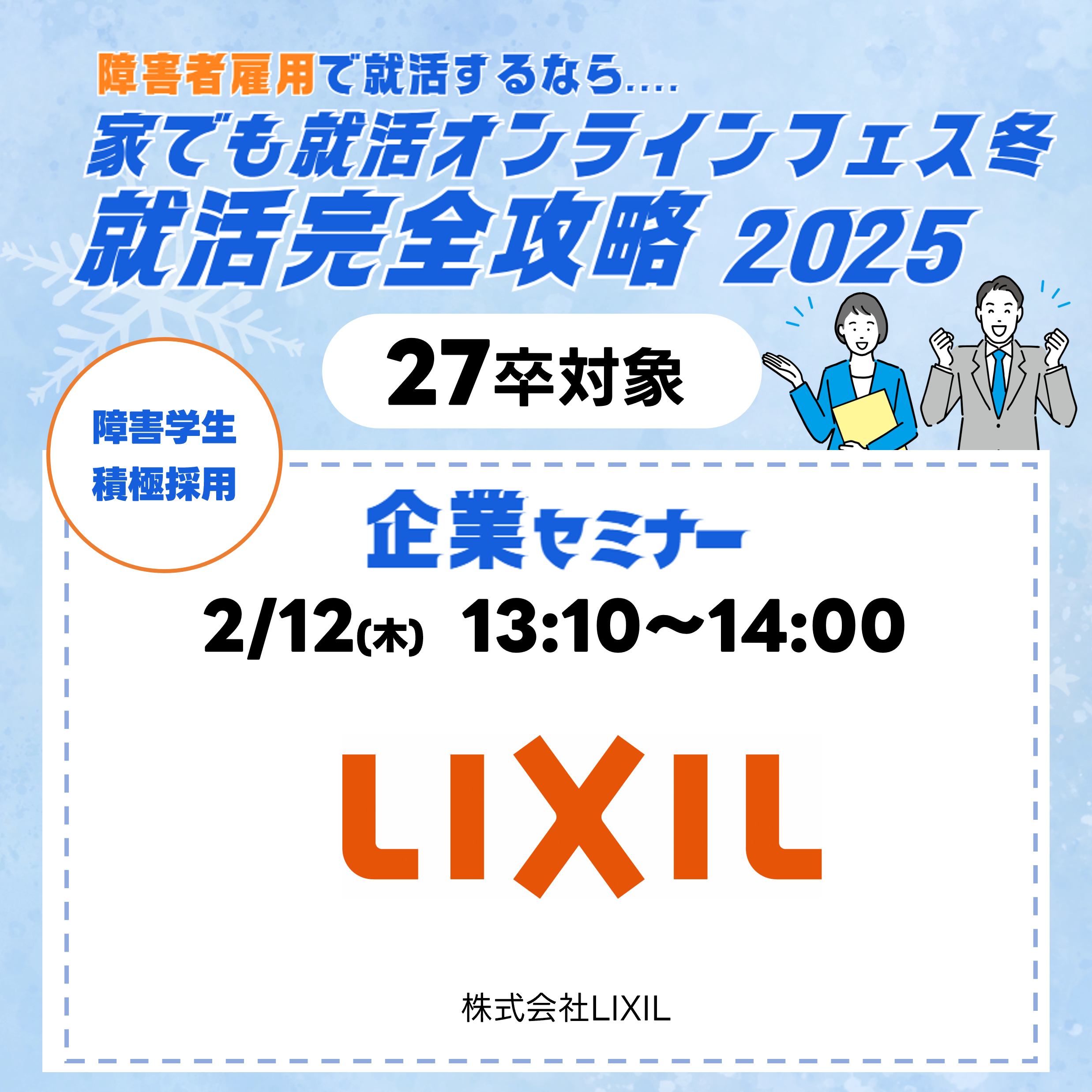 家でも就活オンライン事務局【27卒】就活完全攻略2025ー株式会社LIXILー実施日2026/02/12(木) 13:10~14:00対象者新卒2027年既卒・その他―