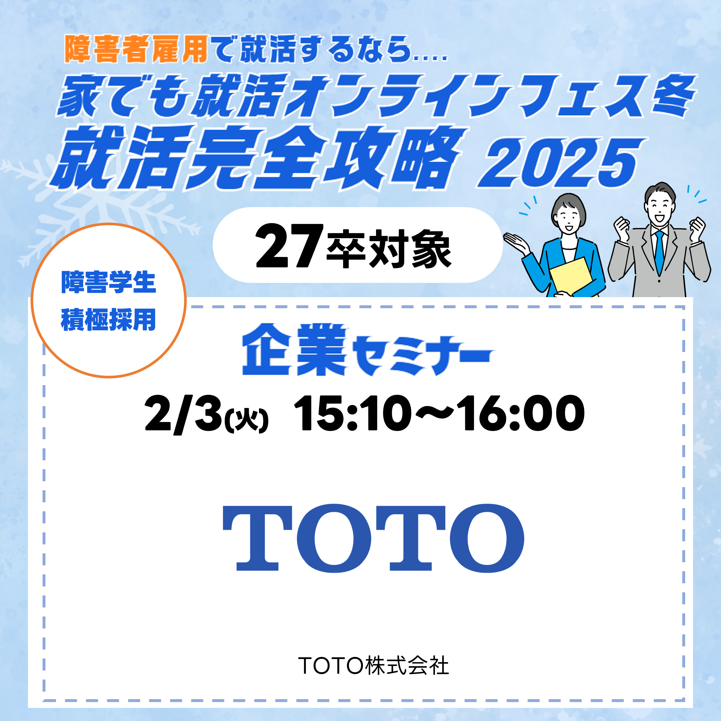 家でも就活オンライン事務局【27卒】就活完全攻略2025ーTOTO株式会社ー実施日2026/02/03(火) 15:10~16:00対象者新卒2027年既卒・その他―