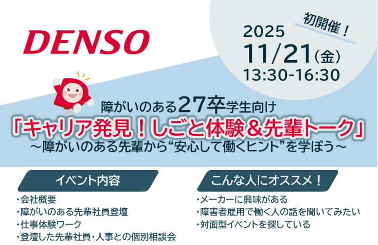 - PLUSTAR ー障害のある学生の就職支援プラットフォームー学校の勉強が仕事につながる トヨタ式プログラム!「じぶん発想ワーク Presented by トヨタ自動車」実施日2025/10/25(土) 13:00~15:00対象者新卒2025年2026年2027年2028年既卒・その他―