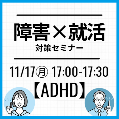 家でも就活オンライン事務局【全学年対象】【ADHD】×就活対策セミナー:先輩のリアル事例+特性に合わせた就活術実施日2025/11/17(月) 17:00~17:30対象者新卒2025年2026年2027年2028年2029年既卒・その他―