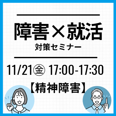 家でも就活オンライン事務局【全学年対象】【精神障害】×就活対策セミナー:先輩のリアル事例+特性に合わせた就活術実施日2025/11/21(金) 17:00~17:30対象者新卒2025年2026年2027年2028年2029年既卒・その他―