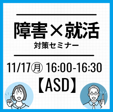 家でも就活オンライン事務局【全学年対象】【ASD】×就活対策セミナー:先輩のリアル事例+特性に合わせた就活術実施日2025/11/17(月) 16:00~16:30対象者新卒2025年2026年2027年2028年2029年既卒・その他―