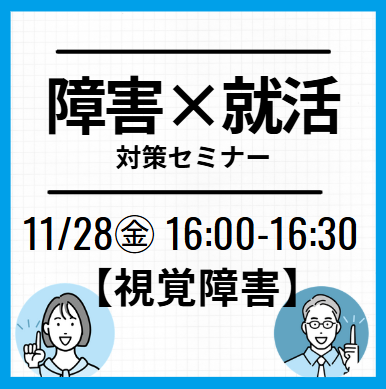 家でも就活オンライン事務局【全学年対象】【視覚障害】×就活対策セミナー:先輩のリアル事例+特性に合わせた就活術実施日2025/11/28(金) 16:00~16:30対象者新卒2025年2026年2027年2028年2029年既卒・その他―