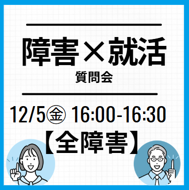 家でも就活オンライン事務局【全学年対象】障害×就活質問会実施日2025/12/05(金) 16:00~17:00対象者新卒2025年2026年2027年2028年2029年既卒・その他―