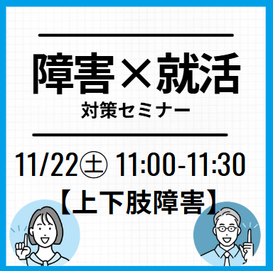 家でも就活オンライン事務局【全学年対象】【上下肢障害】×就活対策セミナー:先輩のリアル事例+特性に合わせた就活術実施日2025/11/22(土) 11:00~11:30対象者新卒2025年2026年2027年2028年2029年既卒・その他―