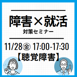 家でも就活オンライン事務局【全学年対象】【聴覚障害】×就活対策セミナー:先輩のリアル事例+特性に合わせた就活術実施日2025/11/28(金) 17:00~17:30対象者新卒2025年2026年2027年2028年2029年既卒・その他―
