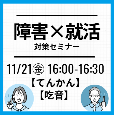 家でも就活オンライン事務局【全学年対象】【吃音・てんかん】×就活対策セミナー:先輩のリアル事例+特性に合わせた就活術実施日2025/11/21(金) 16:00~16:30対象者新卒2025年2026年2027年2028年2029年既卒・その他―