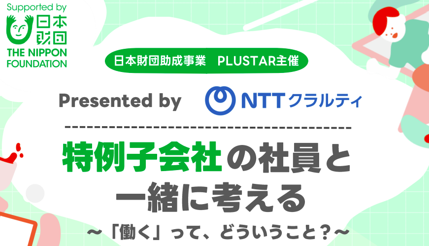 PLUSTAR ー障害のある学生の就職支援プラットフォームー特例子会社の社員と一緒に考える ~働くってどういうこと?~ presented by NTTクラルティ実施日2025/11/22(土) 13:00~15:00対象者新卒2025年2026年2027年2028年既卒・その他―