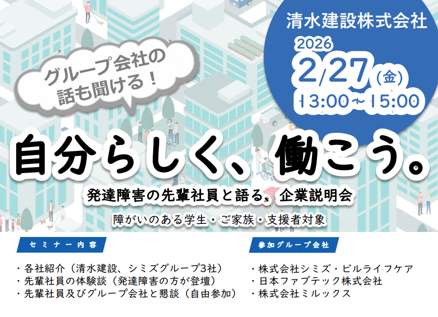 清水建設株式会社自分らしく、働こう。 ~発達障害の先輩社員と語る、企業説明会~対象者新卒2027年2028年2029年既卒・その他―