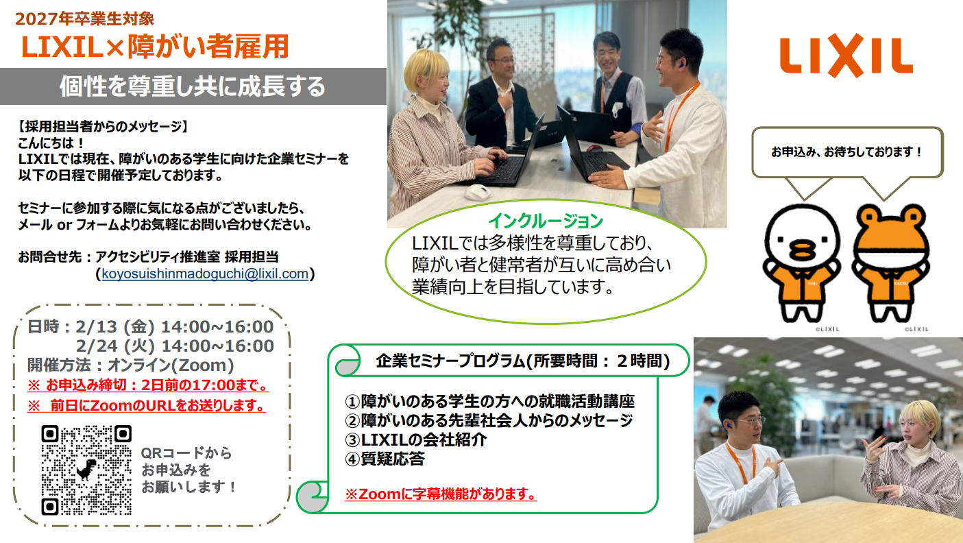 | 仕事内容 | 27卒向け 株式会社LIXIL×障がい者雇用 企業セミナー |